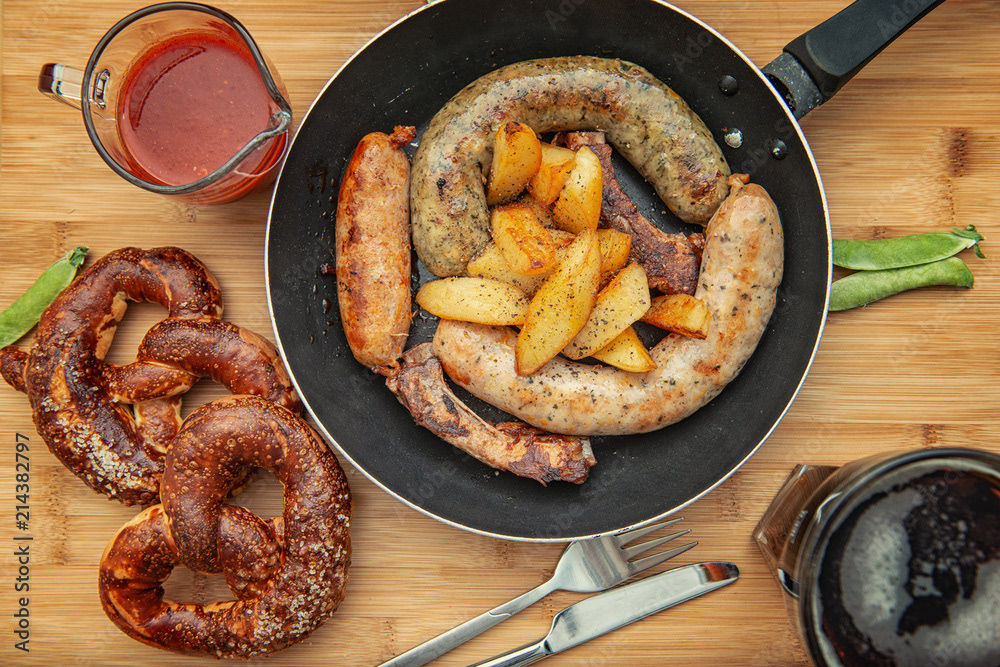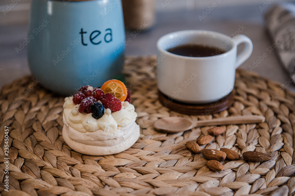 bowl with condensed milk with wooden spoon and biscuits