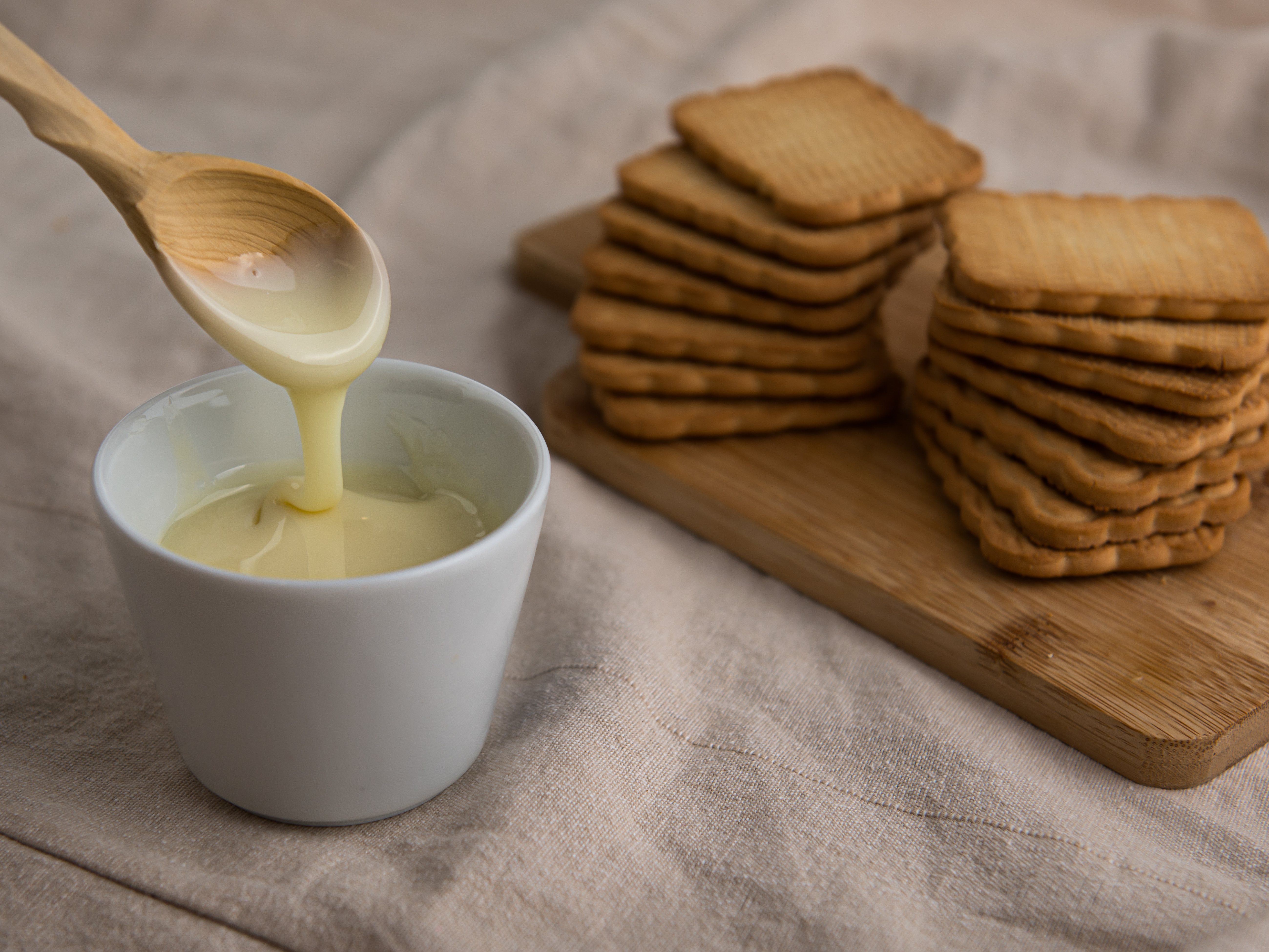 bowl with condensed milk with wooden spoon and biscuits